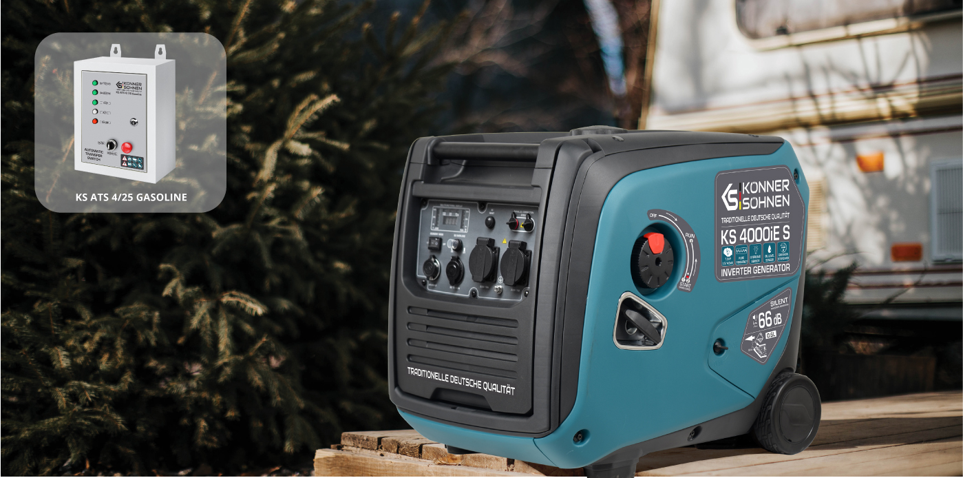 The updated KS 4000iE S inverter generator from Könner & Söhnen® features a possibility of connection for an external ATS unit (Automatic Transfer Switch). The generator control panel has an 8-pin ATS input that is compatible with the KS ATS 4/25 Gasoline ATS unit. The ATS unit automatically starts the generator and switches the load to it when the main power source is turned off.